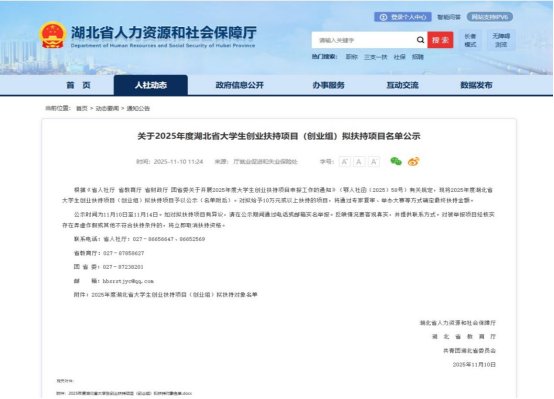 2025年11月,湖北省人力资源和社会保障厅、湖北省教育厅及共青团湖北省委员会联合发布了《关于2025年度湖北省大学生创业扶持项目(创业组)拟扶持项目名单的公示》。我...